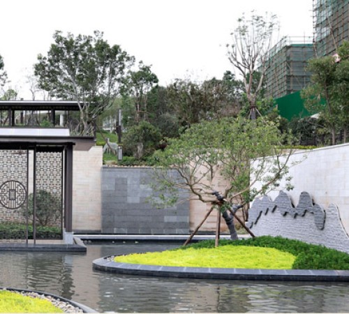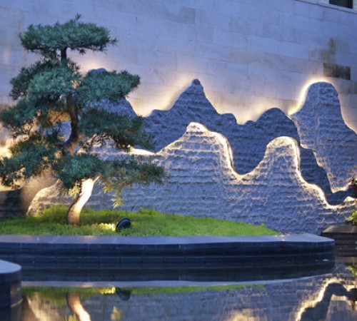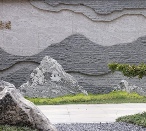 山水景墙以山为形,模仿中国山水画的艺术风格,以淡然飘逸的意境。希望观者以恬淡之心,写山水清晖,神气闲淡,飘逸高古。散发出浓郁的诗意。